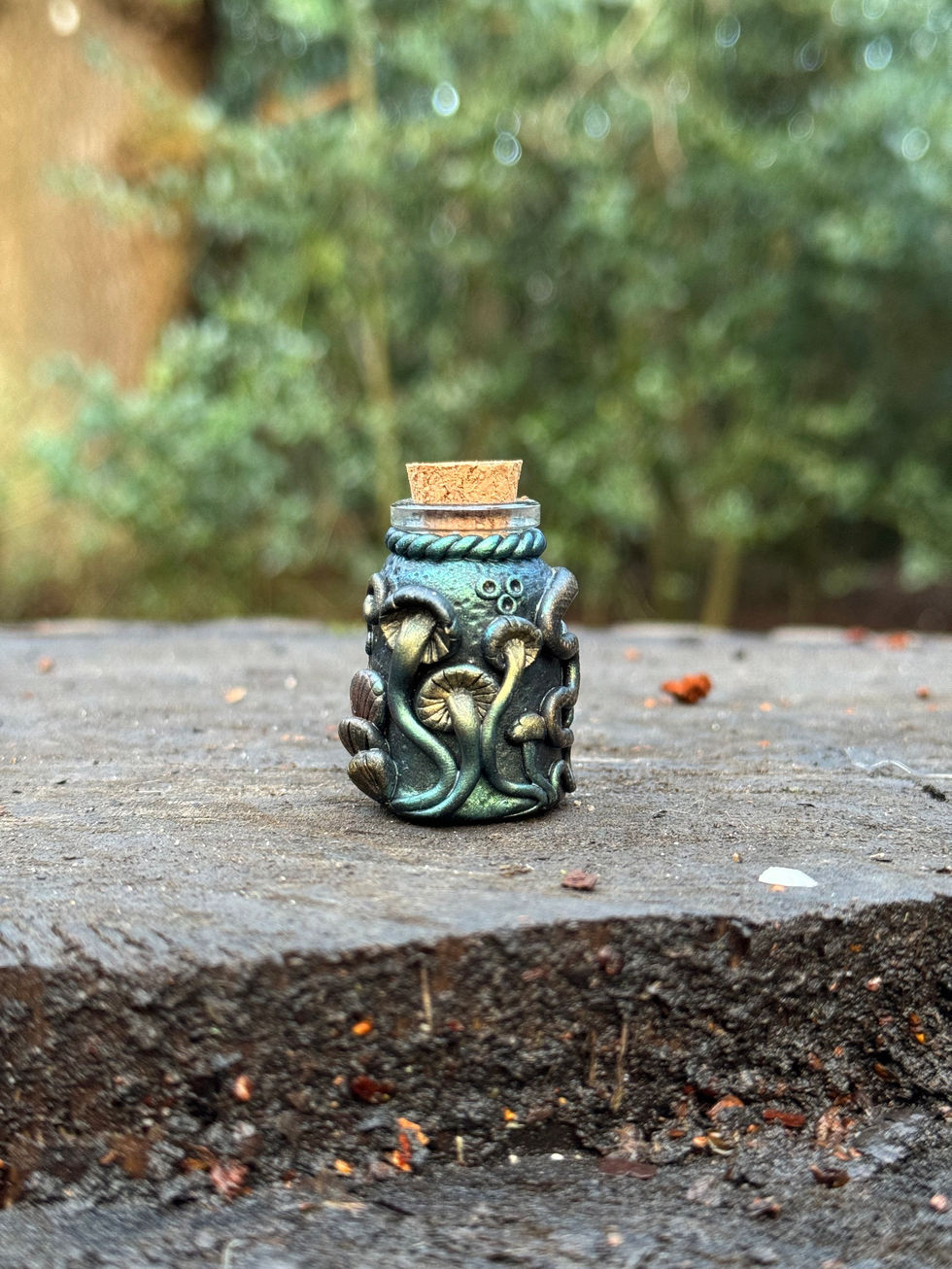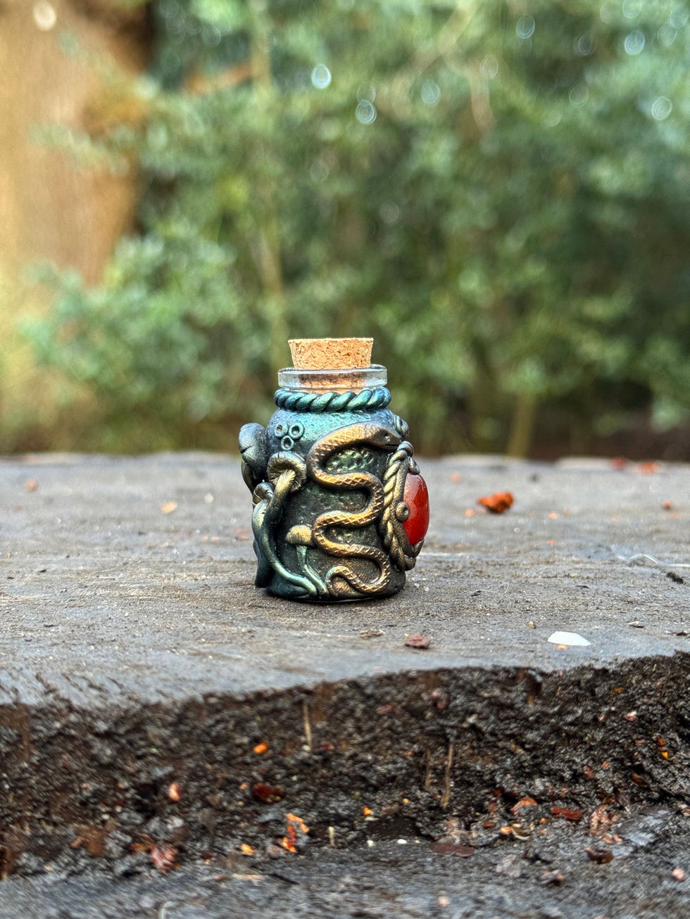 The jar’s decoration is deeply symbolic. A serpent coils around the base, representing the cyclical nature of life, healing, and renewal. Mushrooms, sculpted with meticulous detail, celebrate the wisdom of the Earth and its profound connection to the otherworldly realms. At its heart, a radiant crystal is set into the design, channeling energies of clarity, protection, and spiritual insight.